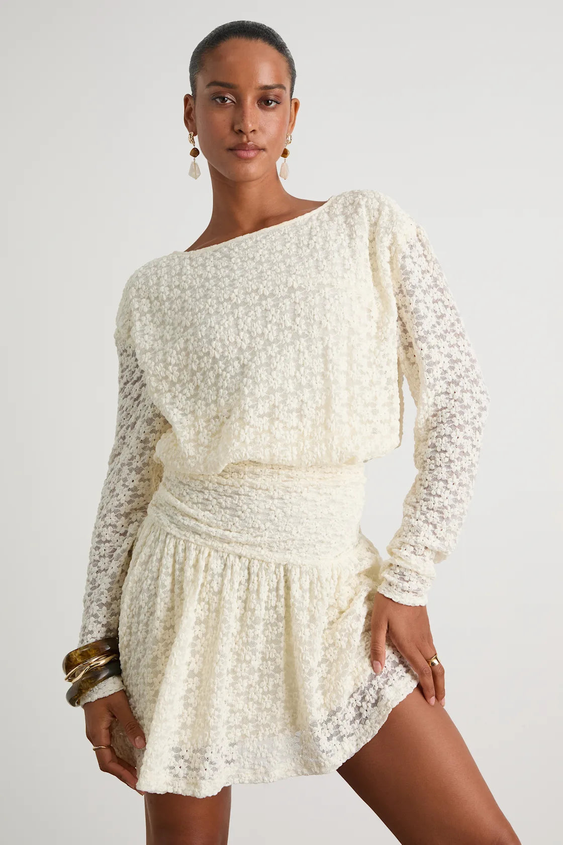 With a flouncy fit crafted from a textured, floral lace-like knit, this too-cute mini dress is a fresh take on a classic silhouette. The blousy bodice features sheer long sleeves, a chic boat neckline, and a drop waist-inspired design with a strategically ruched panel. The flattering A-line skirt offers effortless movement, finishing at an asymmetrical hem for a captivating effect.